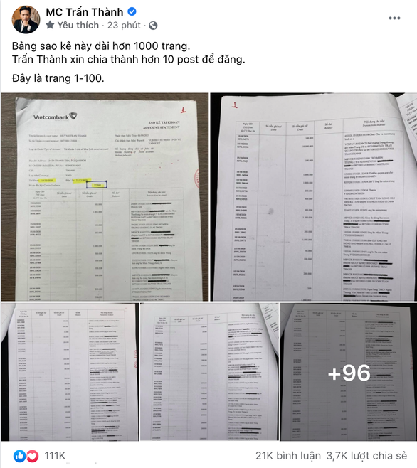Trước đó, ngày 7-9, sau khi MC Trấn Thành đăng tải bản sao kê, MC đã có clip giải thích nhưng nhiều người vẫn tràn vào fanpage của Vietcombank - ngân hàng mà Trấn Thành có tài khoản huy động tiền từ thiện - để bình luận, mổ xẻ bản sao kê.